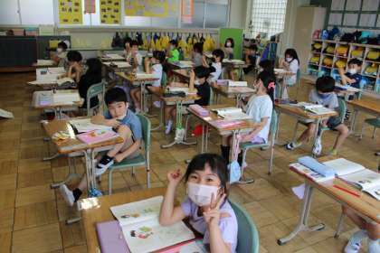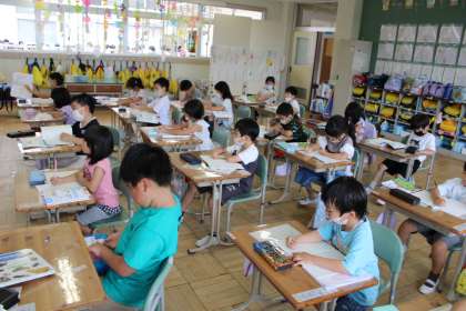 5年2組は理科です。実験中の植物の成長を確認です。1年1組は国語です。1年2組は算数です。