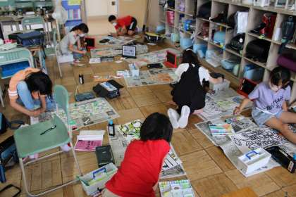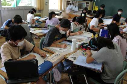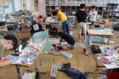 6年2組は総合的な学習です。鯉の学習です。4年1組は図工です。不思議な花の絵を描いています。