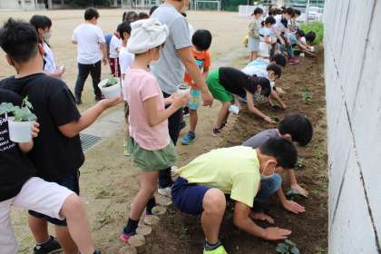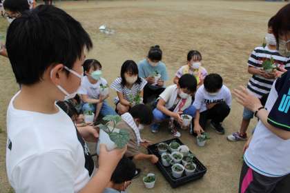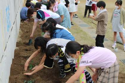 4年生はプールわきのミニ花壇に育てていたヘチマを植え替えました。ここからが楽しみですね。