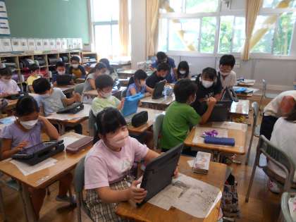 3年2組は図工で、作品を見て感想をまとめています。1年生は跳び箱遊び運動です。跳び越せる子もいます。まずは慣れることが大事です。