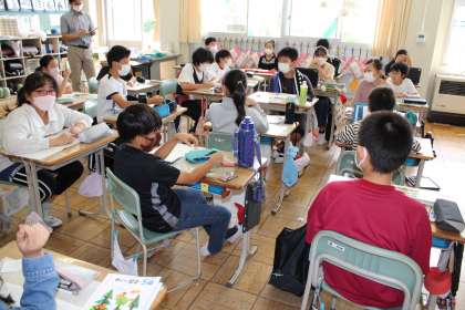 3年2組は社会の学習です。スーパーの学習です。6年1組は国語です。やまなしの学習です。5年2組は算数です。手ごたえのある課題に挑戦中です。