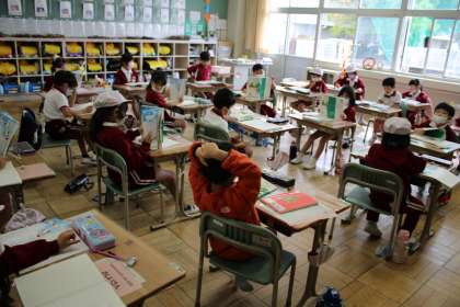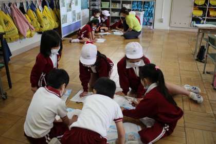 1年1組は国語です。くじらぐもを役割分担してさっそくみんなで読んでいます。1年2組は国語くじらぐも、みんなでジャンプです。くじらぐもに乗れたかな?