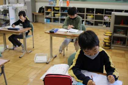 2年生はかおフェスの練習です。すみれ学級は3人で課題に挑戦です。