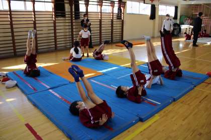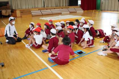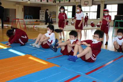 本日は3年2組体育の授業研究です。シンクロマット運動に挑戦です。めあてを確認してマットを使って基本となる準備運動です。
