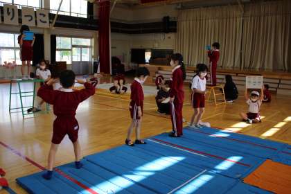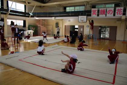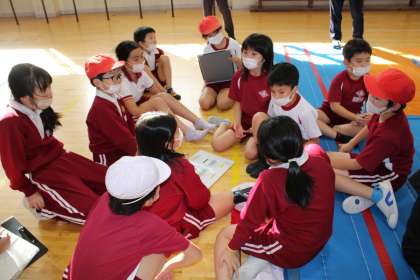 4人グループでさっそく演技、タブレットで動画撮影をして、振り返りに使います。