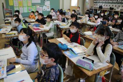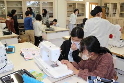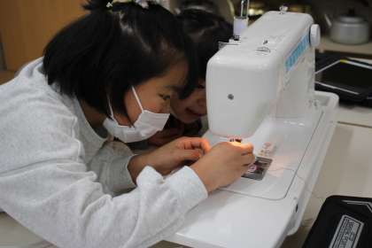 3年2組は社会です。消防署の仕事について映像を見て学習しています。5年1組は家庭科です。ミシンが使えるように糸を導いています。