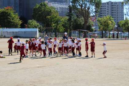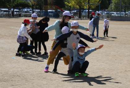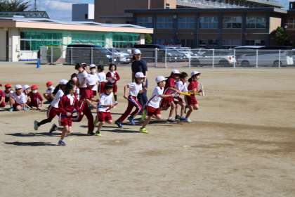 2年生は校庭でみんなでリレーです。どのチームが早いかな。3年2組は理科です。絶好の天気のもと、自分たちの影をグループで作って、つなげています。