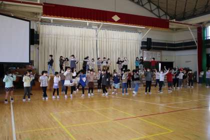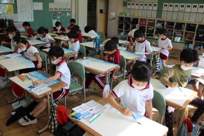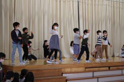 2年1組は図工です。まず基本となるバックの色染めです。3年生はかおフェスの練習です。