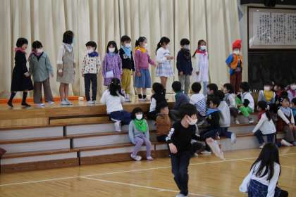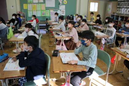 3年2組は外国語活動です。リスニングに挑戦しています。すみれ学級は各自の課題に挑戦中です。1年生はかおフェスの練習です。