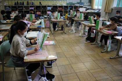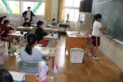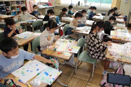 2年2組は国語で、音読中です。2年1組は図工です。自作の魚のスタンプを上手に使って描いています。4年1組は算数です。式が表す意味を考えています。