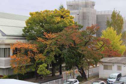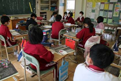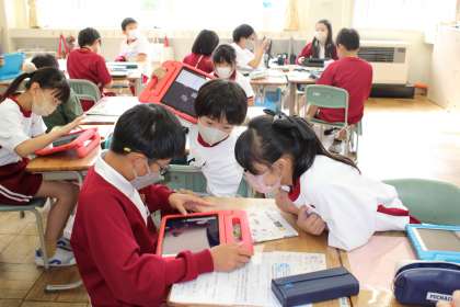 4年2組は道徳です。タブレットに先生から課題が送られてきます。4年1組は国語です。まずはしっかり友達の考えを聴いています。プールわきの樹木、葉が色づきが始まりました。