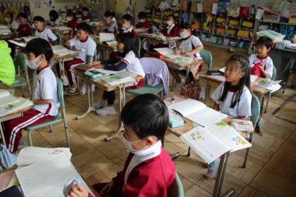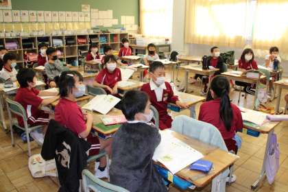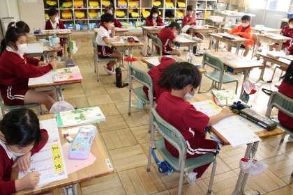 1年1組は国語です。漢字の学習です。1年2組は国語です。早口言葉に挑戦中です。2年2組は国語です。これから音読です。