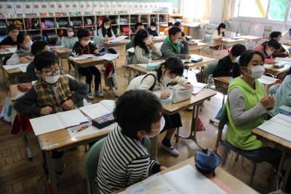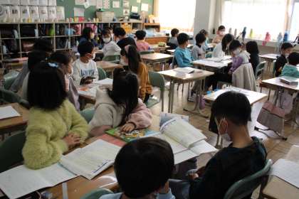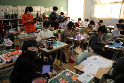 3年1組と3年2組は国語です。友達の話をよく聞いています。6年2組は図工の作品をタブレットで撮って提出しています。