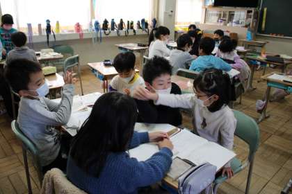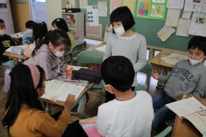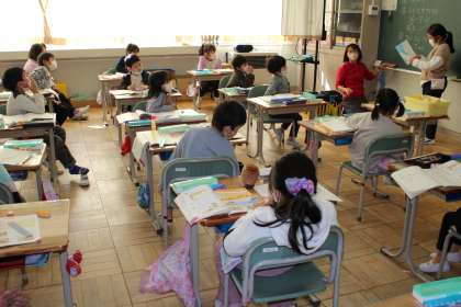 3年1組は国語です。グループで役割分担して取り組んでいます。1年1組は算数です。ひき算の仕方学んでいます。