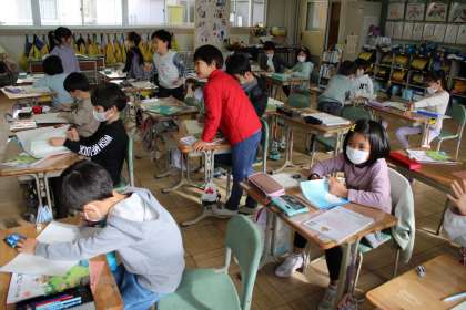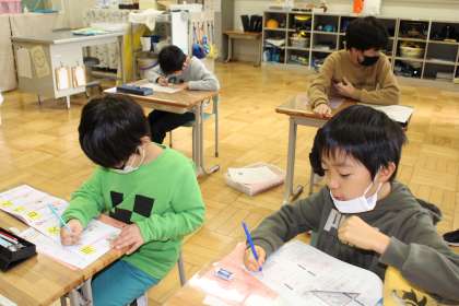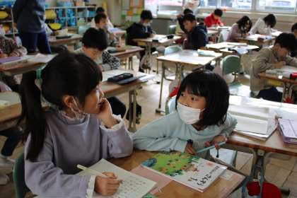 すみれ学級は各自の課題に挑戦中です。1年2組は算数です。友達と話し合って学んでいます。