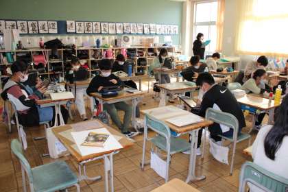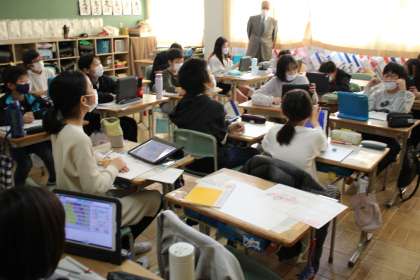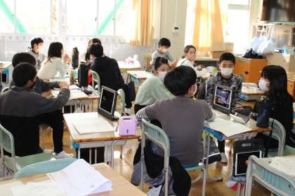 5年1組は社会です。福島大学の同窓会の取材を受けています。5年2組は国語でアンケートに答えています。6年2組はグループで話し合いです。