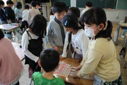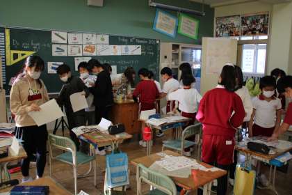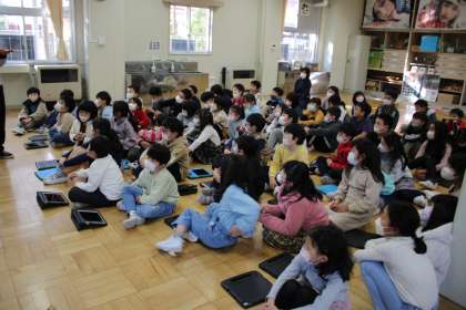 3年生はプログラミング学習のスタートです。まずは全員で確認です。4年1組はAETクロイ先生と外国語活動です。1年2組は算数です。友達と話し合っています。