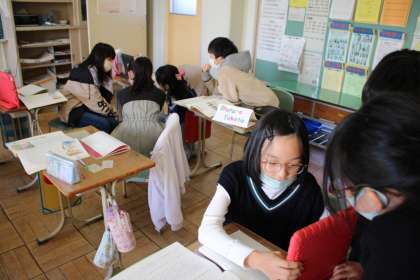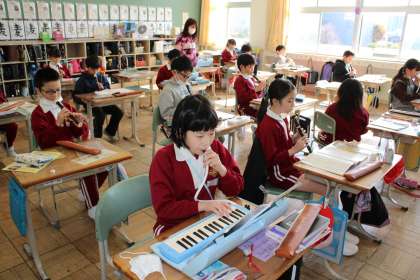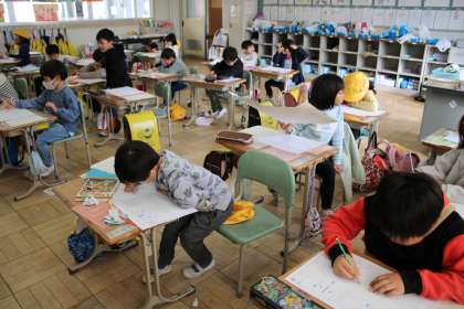 4年1組は国語です。グループで活動です。4年2組は音楽です。鍵盤ハーモニカとリコーダーに挑戦です。1年2組はプリント学習です。