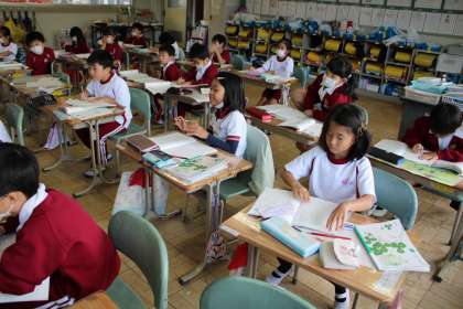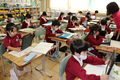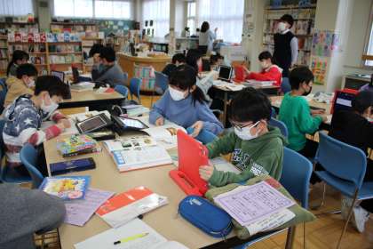 1年1組は国語です。自動車について紹介する文章を仕上げています。1年2組も国語です。カタカナの学習です。4年1組は図書室で伝統工芸について調べてまとめています。