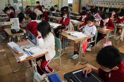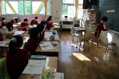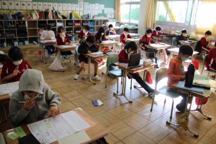 2年2組は国語のテスト中です。3年1組は道徳、資料を読んで感想をタブレットに記入し、送信しています。3年2組は算数です。