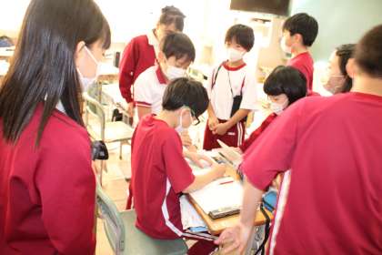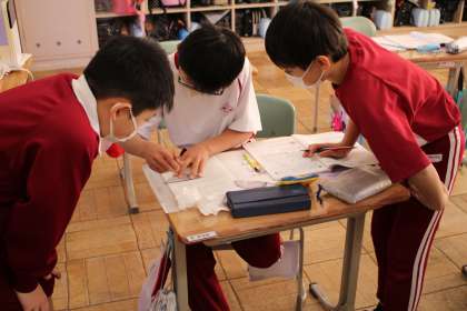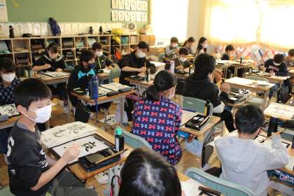 5年1組は習字です。集中しています。4年2組は算数です。みんなで確かめ合っています。