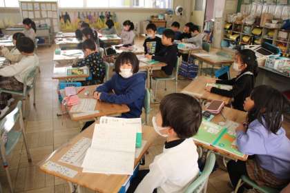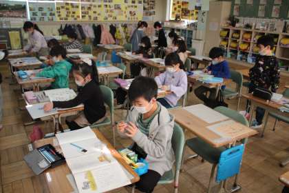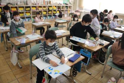 1年1組は算数です。図形の学習です。三角形を組み合わせて、いろいろな形を作っています。1年2組は国語です。集中して話を聞いています。