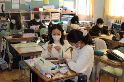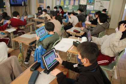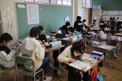 6年2組は卒業制作、作業も進んでいます。早い子はもうニスを塗っています。5年1組は外国語科の学習です。タブレットを使って英単語の発音練習です。