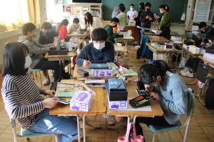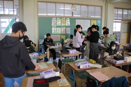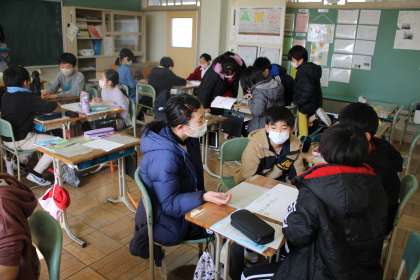 6年1組は卒業制作、オルゴール入りケースだいぶ出来上がってきました。5年2組は家庭科で、賢い買い物の極意、3か条をグループで考えています。