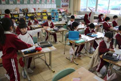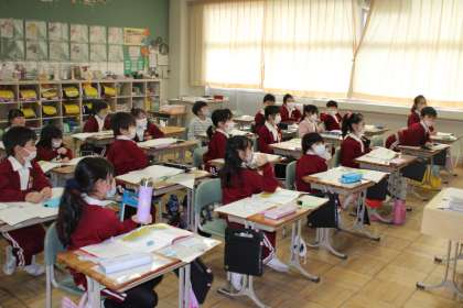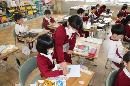 1年1組は国語です。1年2組は算数です。先生が出した形と同じ形を作ります。