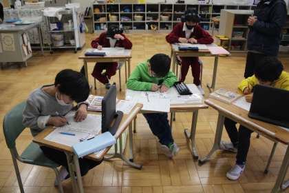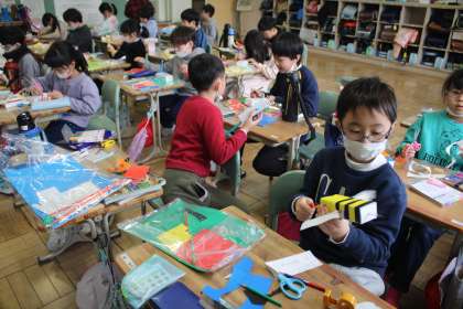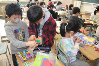 2年1組は図工です。ストローを使って動く仕組みの作品づくり進んでいます。すみれ学級は、集中して課題に取り組んでいます。