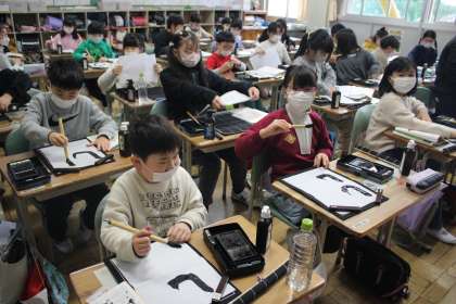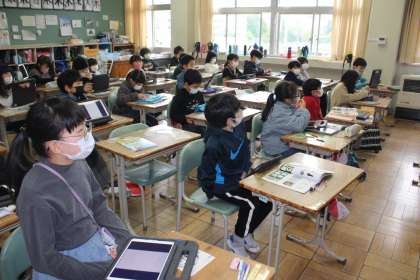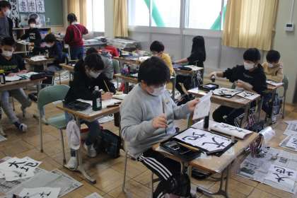 3年1組は外国語活動です。集中して聴いています。3年2組は習字です。はねの練習です。4年1組も習字です。清書日のようです。