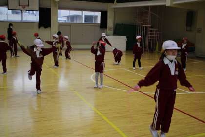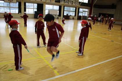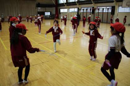1年生は体育館で縄跳びの練習です。いろいろな技に友達と一緒に挑戦しています。