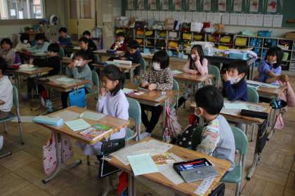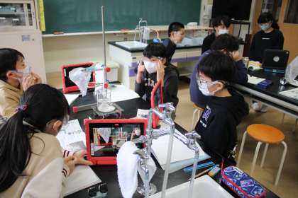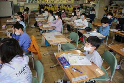 1年1組と1年2組は、木曜日に芳山小学校を訪問する幼稚園生のためにどうするか話し合っています。4年1組は理科です。水を蒸発させる実験です。
