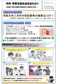 夏休みに入り、児童生徒の痛ましい事故の報道が続いています。あらためて、子どもたちが安全に過ごすことができるように、交通事故防止・不審者被害事故防止・水の事故防止等について学校だより第19号に掲載しました。