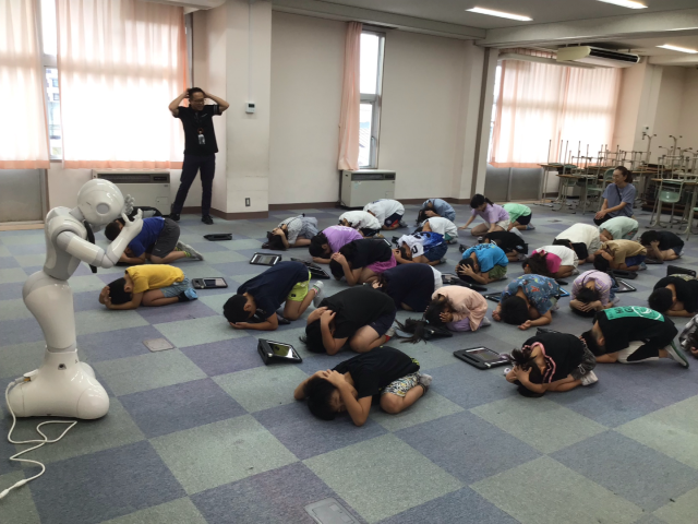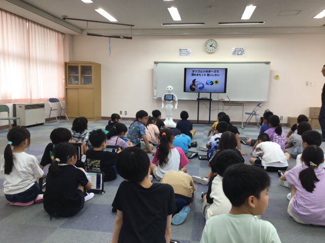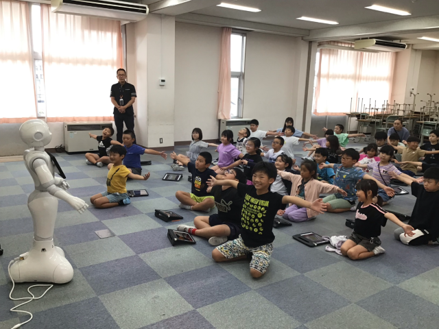 ペッパーくんに、どんな時も「頭を守ること」が大切だと教えてもらいました。「ダンゴムシのポーズで頭を守って低い姿勢」がポイントです。子どもたちはペッパーくんと一緒にダンゴムシのポーズをしたり、体操をしたりしながら、楽しく学ぶことができました。
