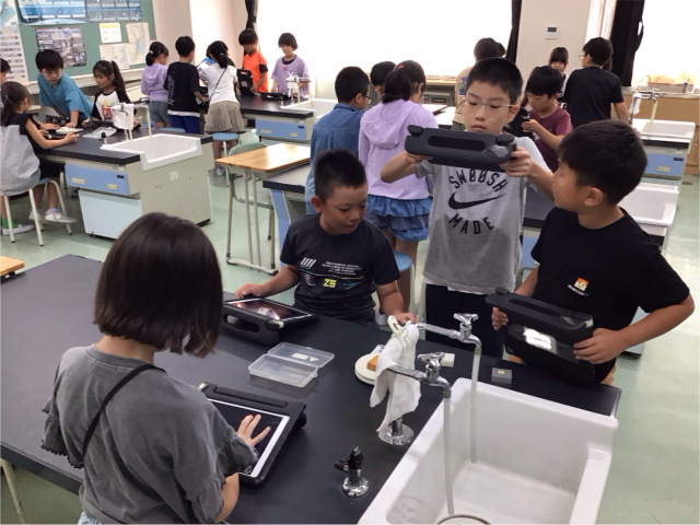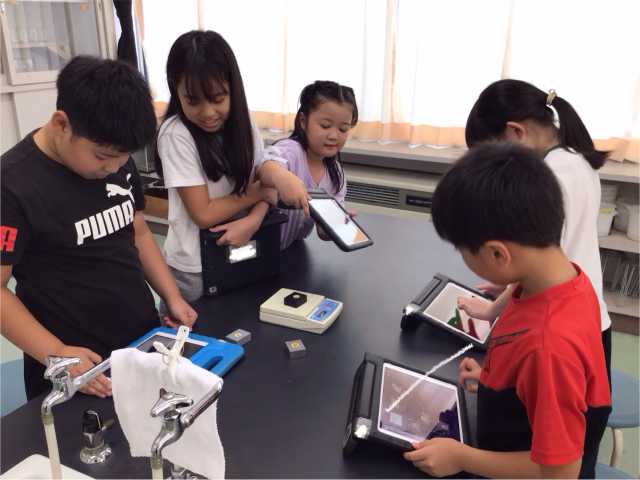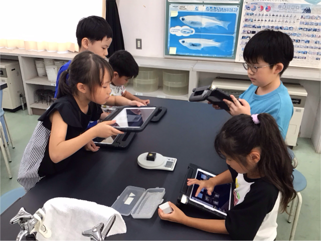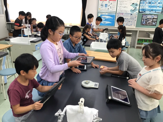 理科「物の重さ」の学習の様子です。この日は、同じ体積の6つの素材の重さを比べ、ランキングを作りました。予想と結果がぴったりで大喜びの子どもたちでした。さらに、アルミは鉄の3分の1の重さだと気付いた子どもたち。軽さと丈夫さを生かして、生活の中で身近なものにたくさん使われていることを知り、驚いていました。