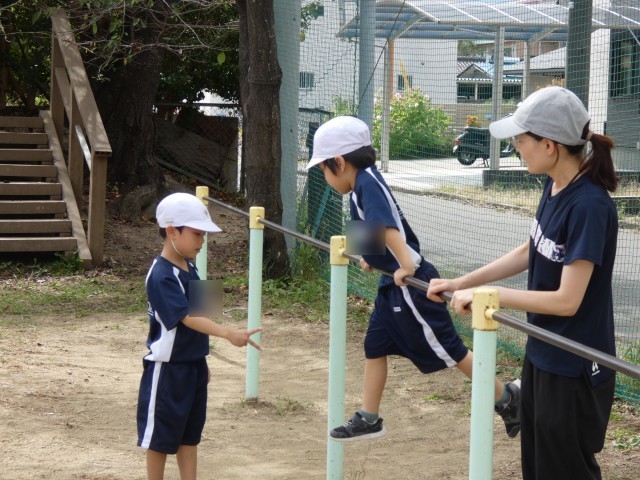 鉄棒じゃんけんをする1年生! 鉄棒にのぼるだけでも大変ですが、じゃんけんなので大変さも忘れて楽しく活動していました!