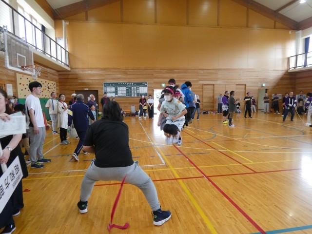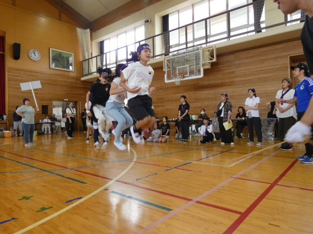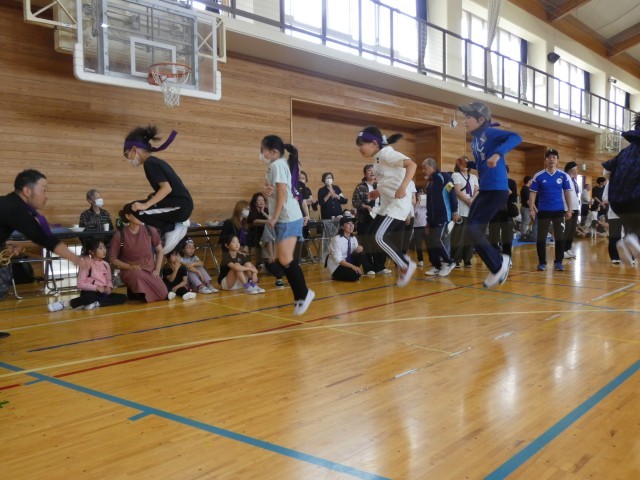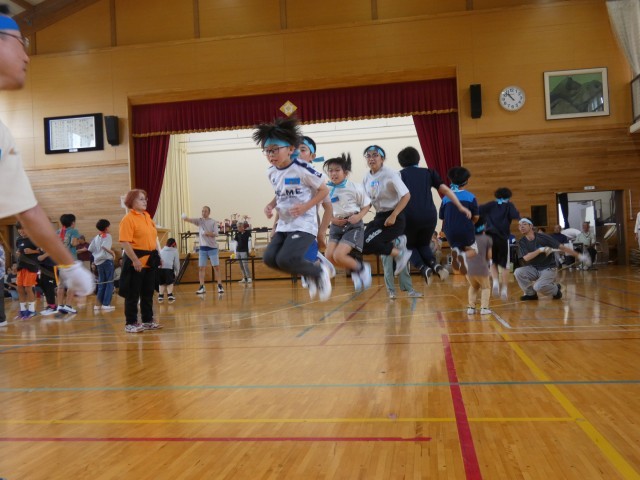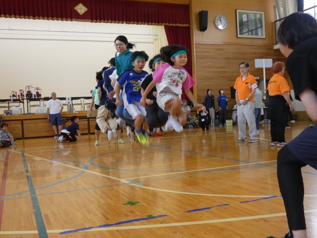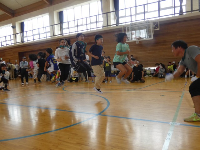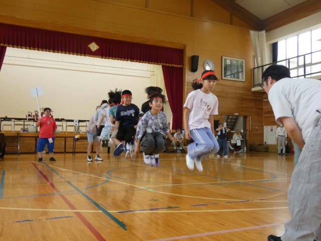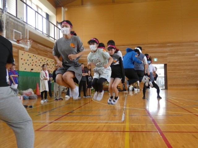 今回紹介する最後の種目は、なわとび競争です。2分間の大縄跳び! 心を合わせて跳びました。