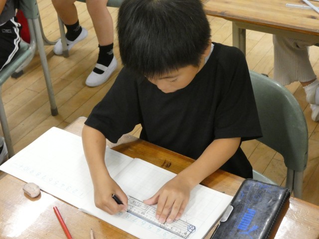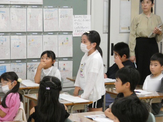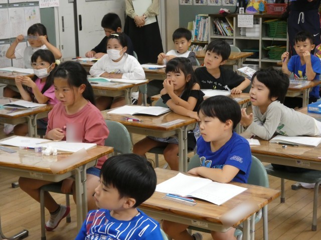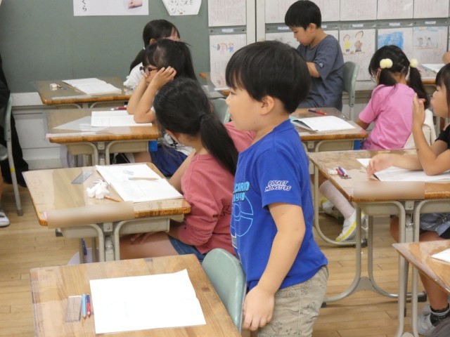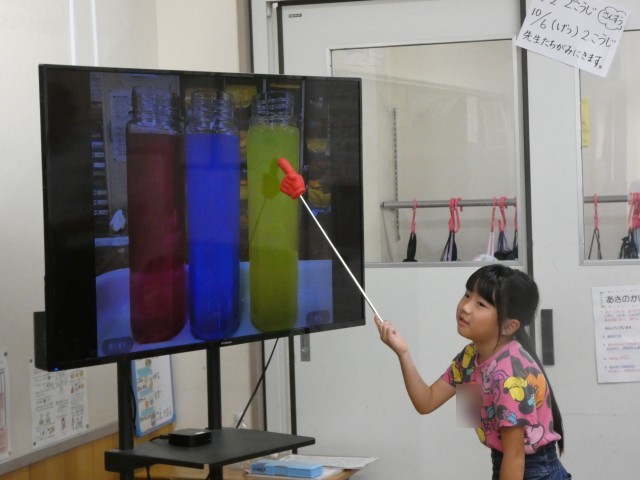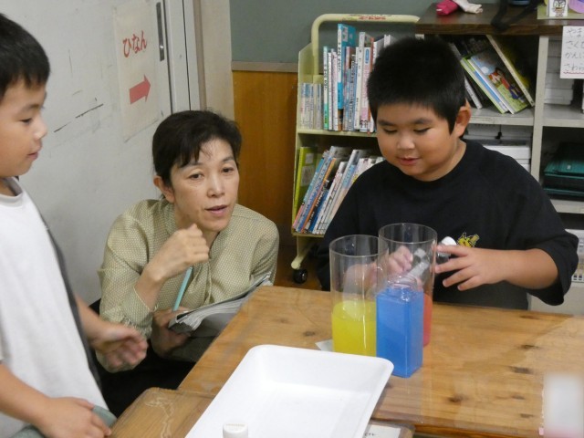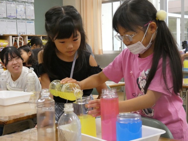 異なる容器に入った水のかさも、同じ容器に入れて比べればよいことに気づいた1年生! またできることが増えました。