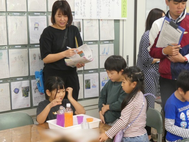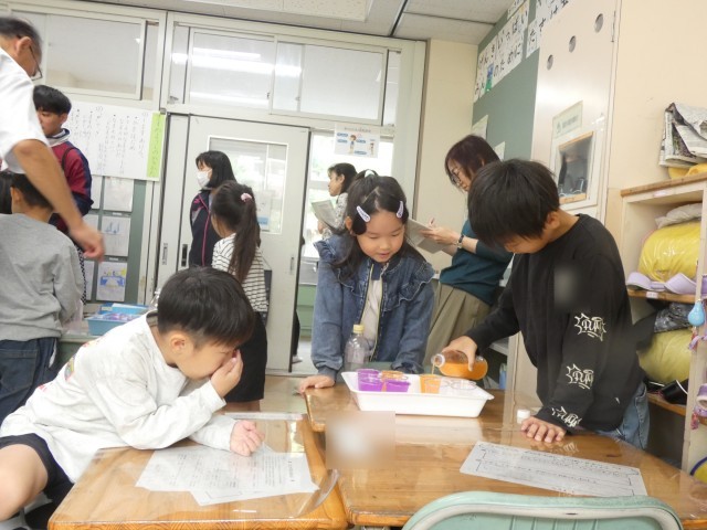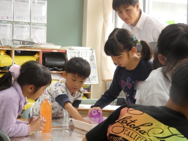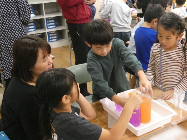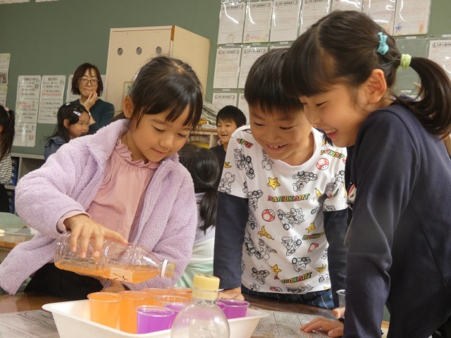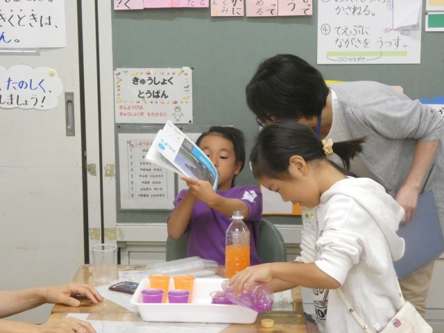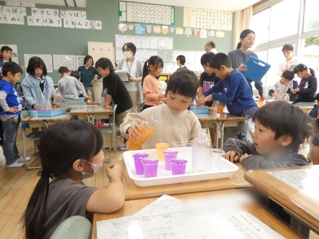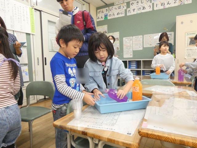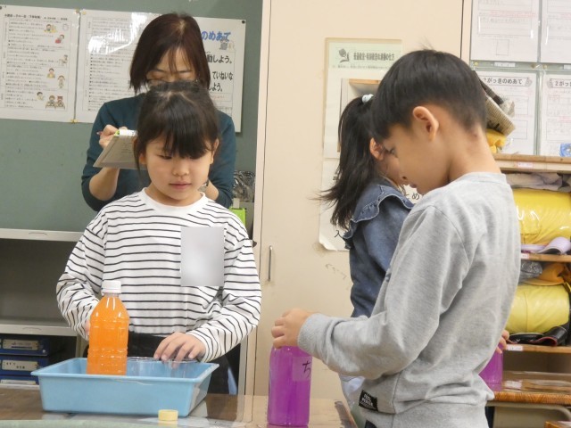 2種類のペットボトルに入った水のかさが「どのくらい」違うか調べた子どもたち。コップを使うことで、具体的に違いを求めることができていました。