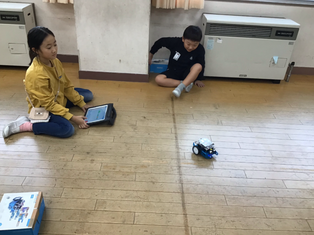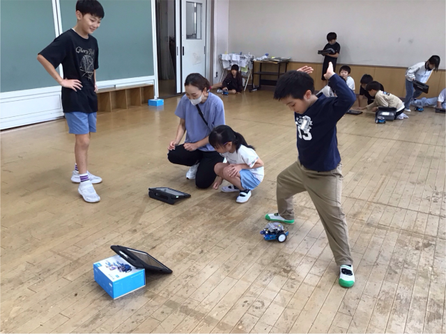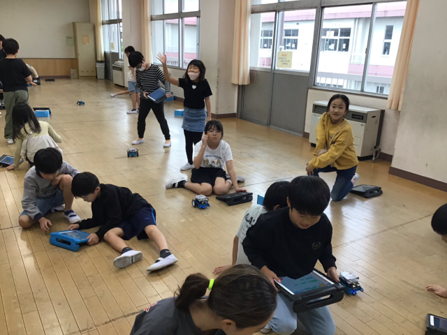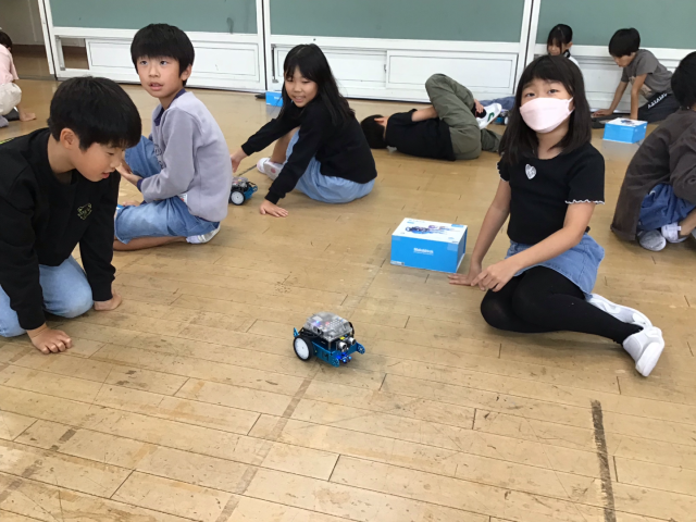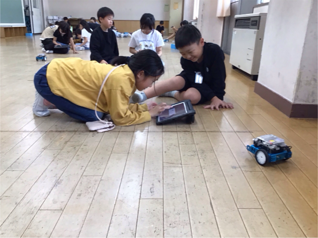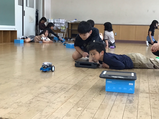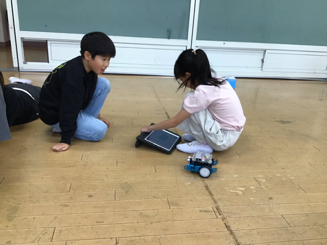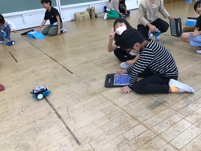 今日のミッションは、「四角に動かそう」でしたが、次々とクリアしていったので、「三角に動かそう」と「円を描くように動かそう」にもチャレンジしました。たくさんのプログラムを作って、試していました。6校時なのに、集中力を持続させ、がんばりました。
