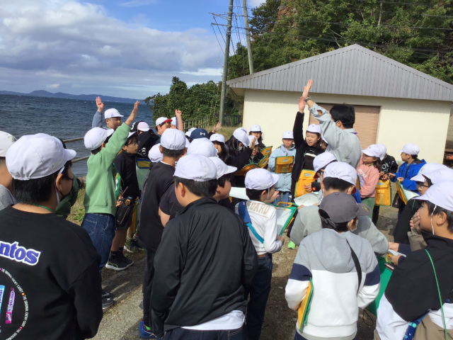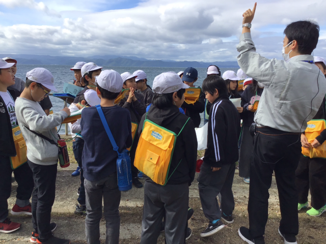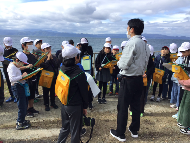 まずは上戸頭首工の見学です。冷たい風が強く吹いていましたが、子ども達は説明してくださる方の話を熱心に聞き、一生懸命メモをとっていました。