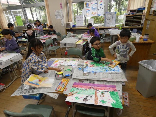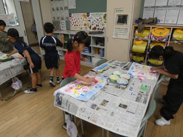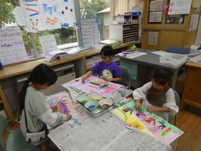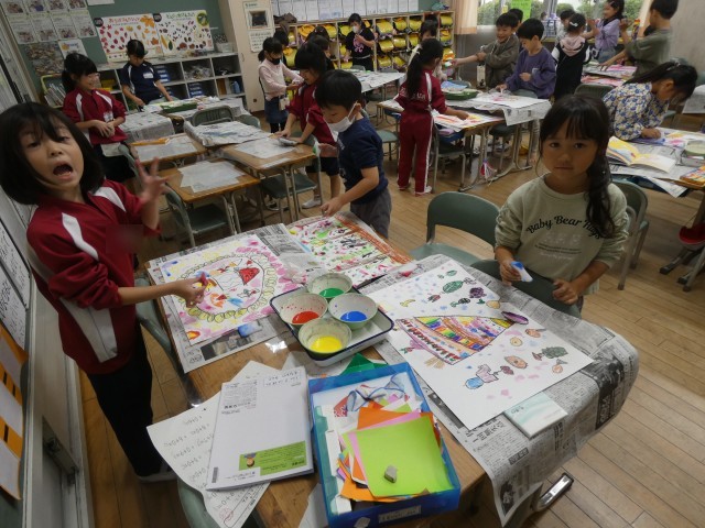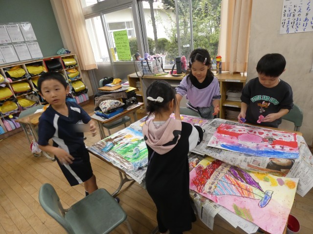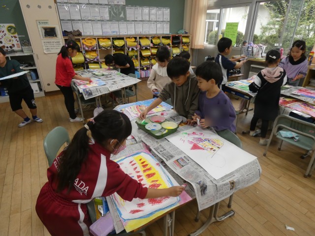 図画工作科の時間、色を上手に使って作品をつくる1年生! 色を組み合わせて、素敵な作品をつくる姿は、まるで色の魔術師ですね。