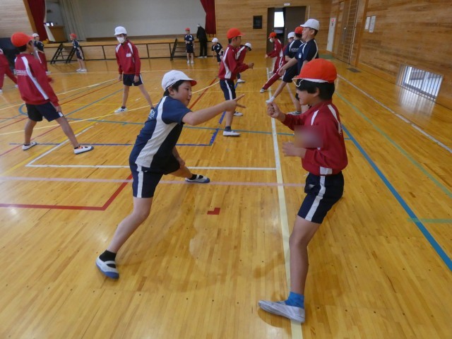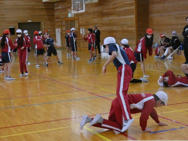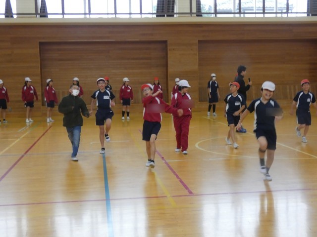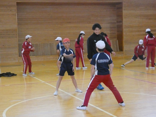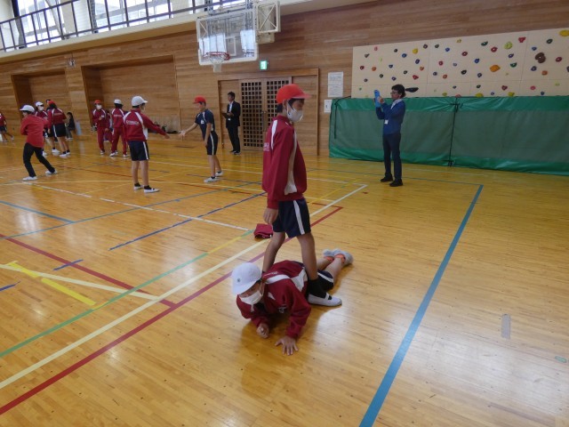 ファイヤーボンズの方を先生にし、体づくりの動きを教えてもらった6年生! 楽しく活動しながら、全力で体を動かしていました。思ったよりもハードな動きで、「疲れた!」の声があちらこちらから聞かれました。
