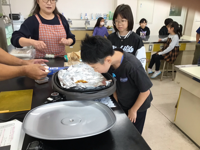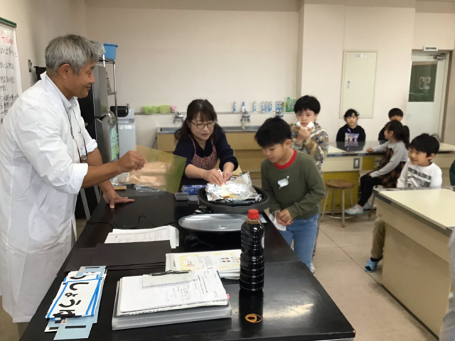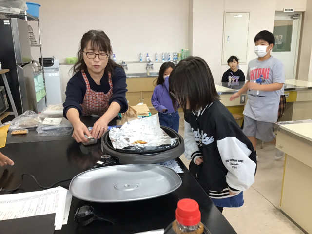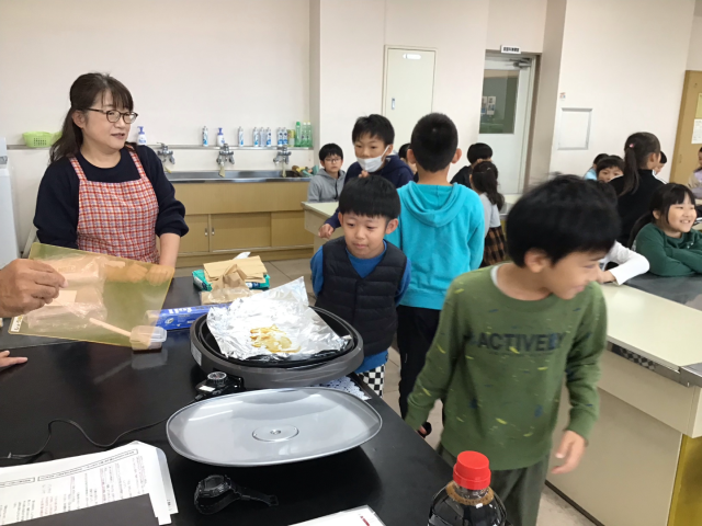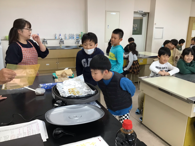 10月27日()は、会津若松市のイゲタ醤油から、外部講師をお招きし、「しょうゆのひみつ」について学習しました。この写真は、しょうゆを熱して香りを嗅いだいる様子です。