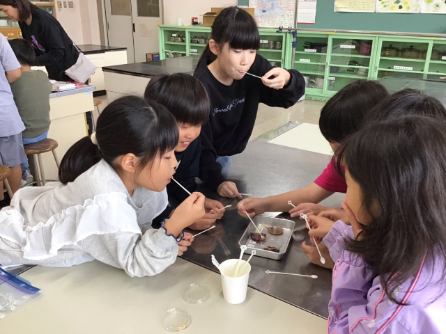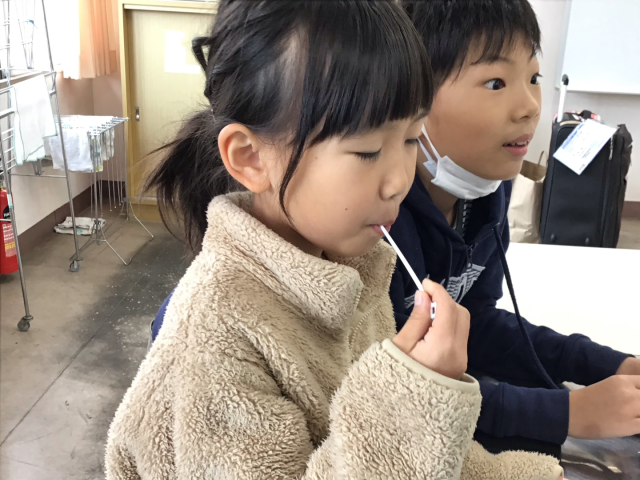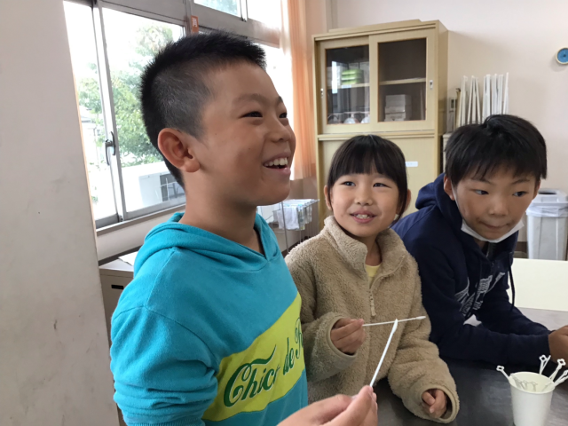 3種類のしょうゆを味見させていただきました。この写真の子どもたちの顔を見れば伝わると思いますが、ぜひ、ご自宅でも感想を聞いてみてください。子どもたちは、大豆からしょうゆができること、微生物が働き発酵がおきることでおいしいしょうゆができることを理解できたと思います。さっそく給食で「どれに醤油が使われているのかな?」という会話が聞こえました。
