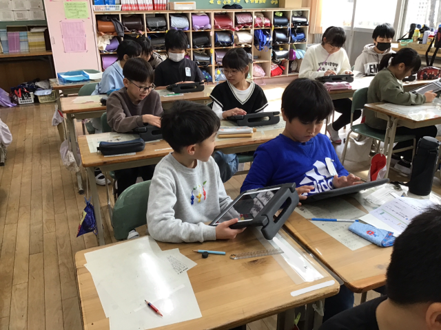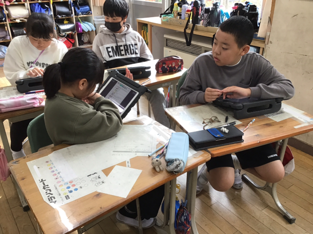 まずは、教室、廊下、階段など、それぞれの場所で地震が起きた時、どのような行動をとれば良いか友達と一緒に考えました。地震の時は、まず姿勢を低くして頭を守り、むやみに動かないことが大切であることを学びました。机の下にもぐる時は、机の脚を持って支えることでより安全になるので、それを実際にやってみました。