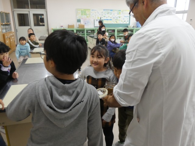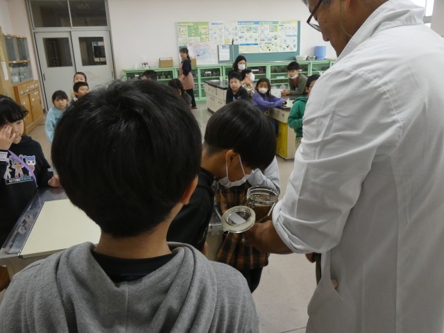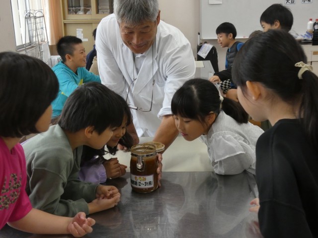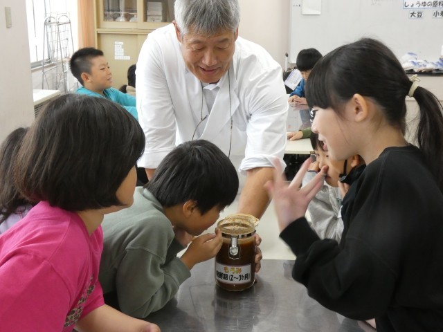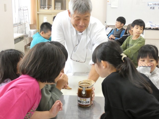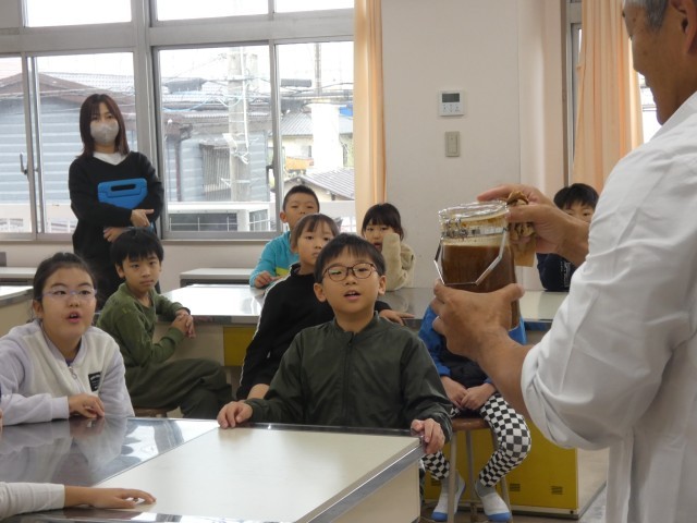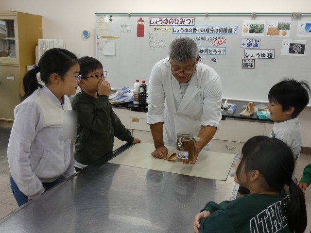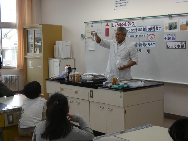 国語科で学習している「大豆」の変身。「姿をかえるだいず」の学習を確かめるために、総合でしょう油出前授業を行いました。