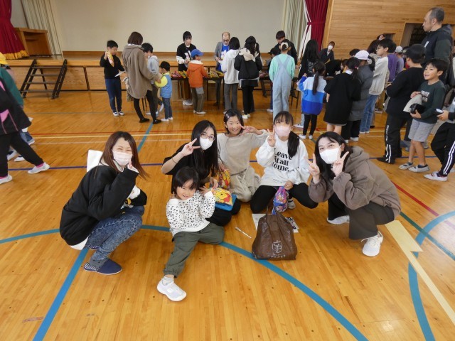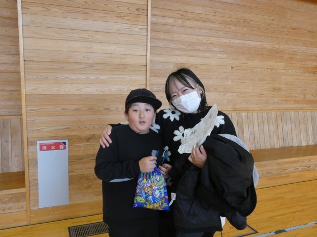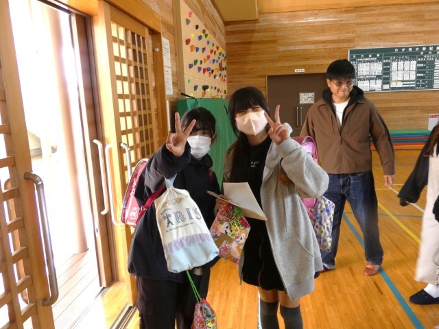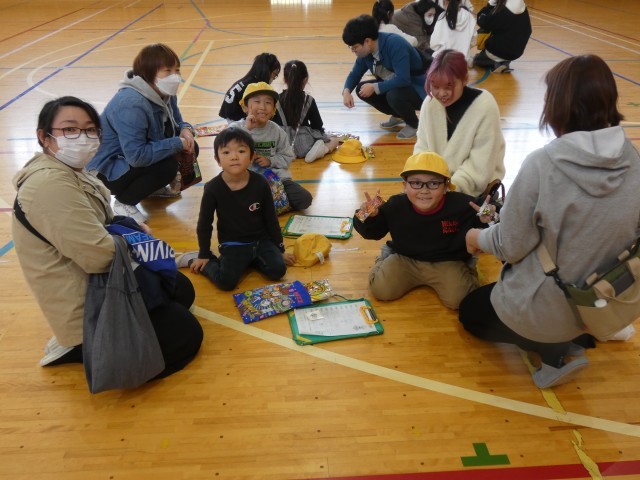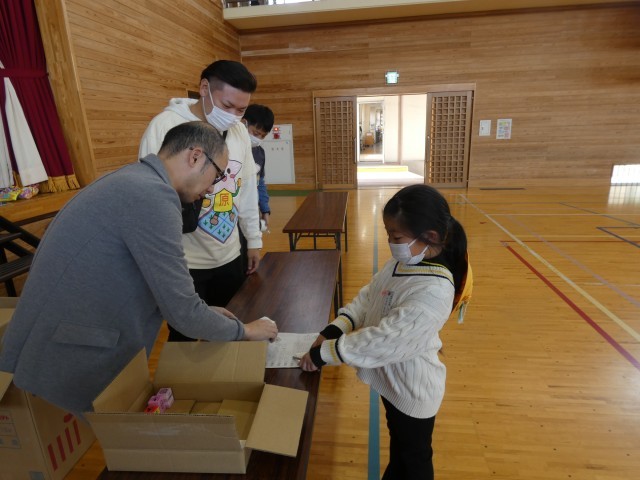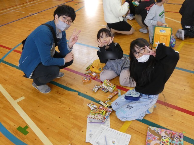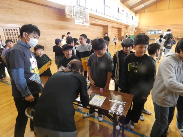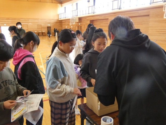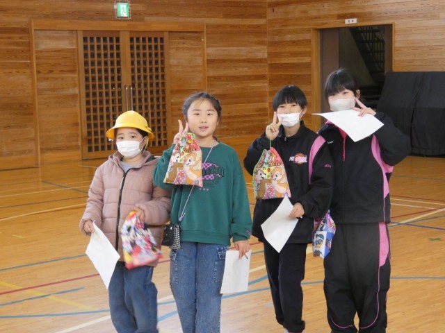 問題を解き終わると、急いで体育館に集まる子どもたち! 参加賞をもらって大喜びの様子でした。