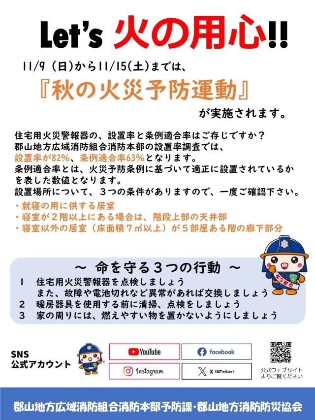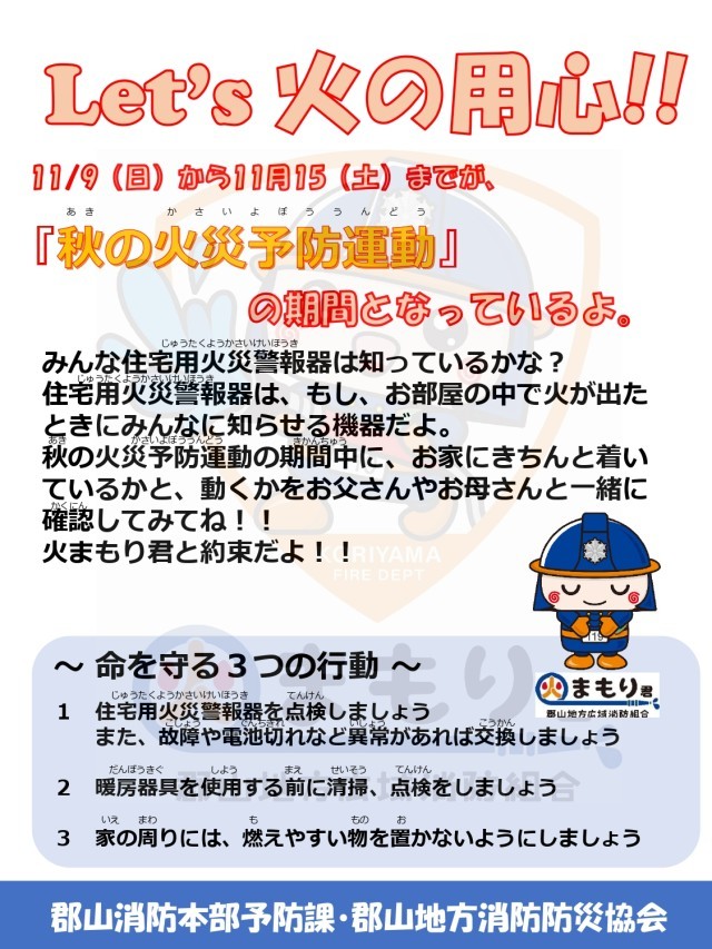 11月9日から15日まで、秋の火災予防運動が実施されます。この時季は、空気が乾燥し、火災が起こりやすくなっています。